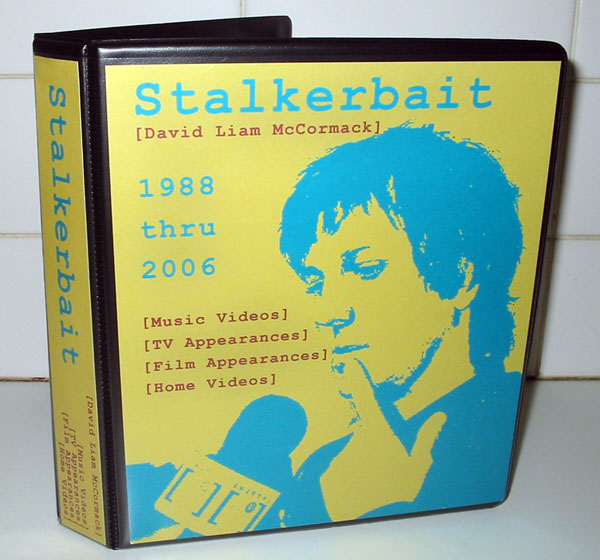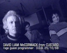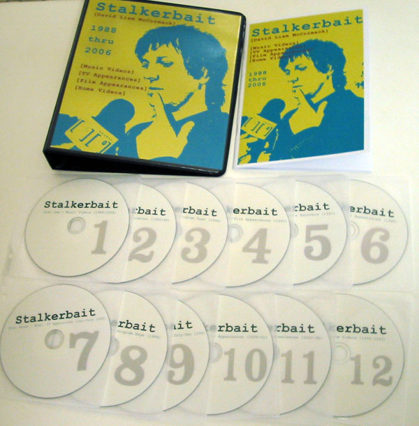 Stalkerbait - David McCormack / Custard DVDLast updated June 2011 About Stalkerbait * Tracklisting * Videos * Availability This page contains some information about the Dave McCormack Stalkerbait DVD set. Stalkerbait is the name of a DVD set that I (the music is crap webmaster) originally put together back in 2006 and early 2007. The aim was to compile some rare Custard and Titanics footage for myself, Mr McCormack, and some over enthusiastic fans. Several people contributed footage to the set. The original Stalkerbait DVD set comprised 12 discs and contained over 20 hours worth of music videos, television appearances, film appearances and home videos. It spanned the years years 1988 to 2006 and included footage of Who's Gerald?, Custard, The Titanics, The Polaroids and more. Each copy came with a 32 page colour booklet featuring tracklisting, photos, excerpts from humorous old interviews with Dave, and so forth. I made copies for the people who contributed footage to the set, and for a small number of fans. In mid 2007 I compiled a Stalkerbait 'bonus disc'. This featured additional footage that I unearthed after the main Stalkerbait collection had been completed. In November 2010, I finished a second bonus disc. The current version of Stalkerbait comprises 14 discs, contains around 25 hours worth of footage, and encompasses the years 1988 to 2010. Disc 01..........Music Videos