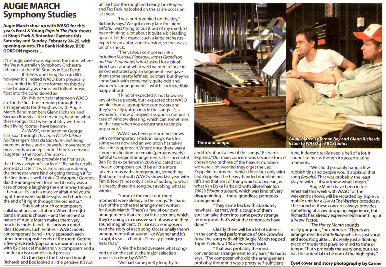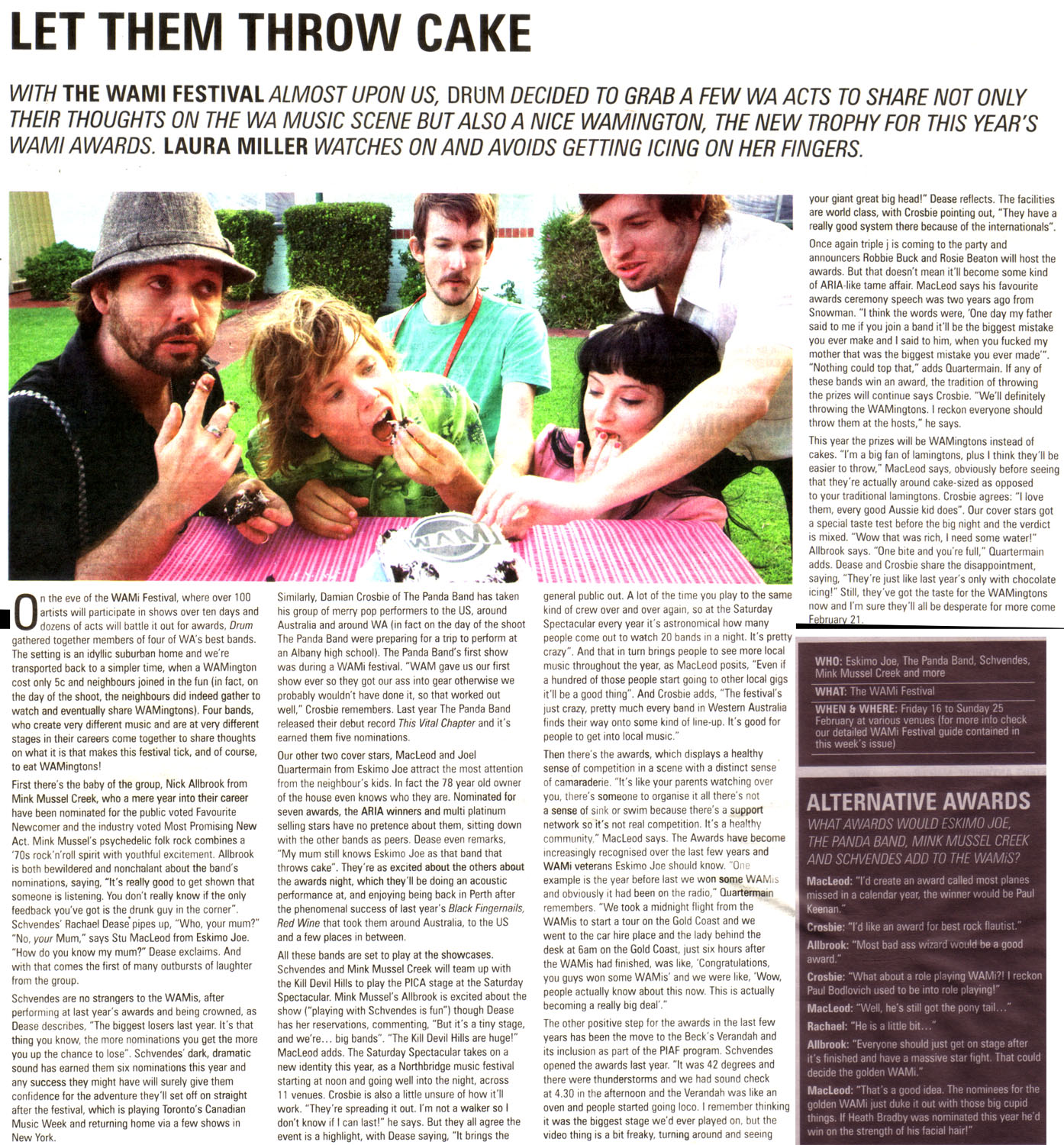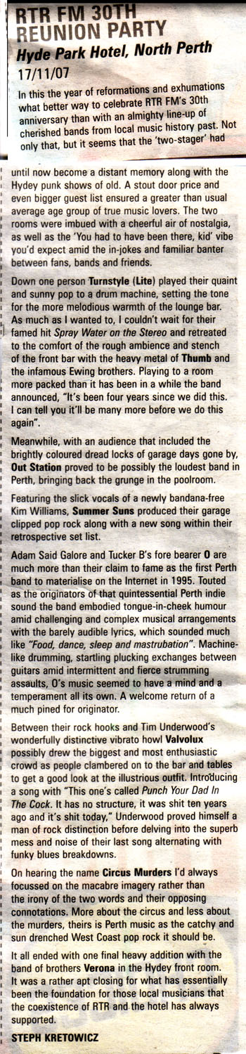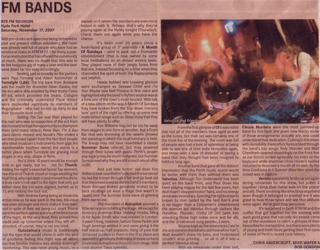 2007 was a year for both farewell shows (Mach Pelican, Subtruck) and reunions. Autopilot played a wonderful reunion set at the Hydey as part of RTR's 30th Anniversary show. Earlier in the year, Al, Wayne and Grant from the Fergusons played a one-off acoustic show on a Thursday night at Mojos. They played some Fergie classics, and a great cover of Pink Triangle by Weezer. At the end of the set, the band was joined onstage by members of Eskimo Joe and Little Birdy, and they knocked out Throw Your Arms Around Me. Towards the end of the song, Al jumped off stage, ran over to his girlfriend, got down on one knee and proposed to her. It was a surreal moment.