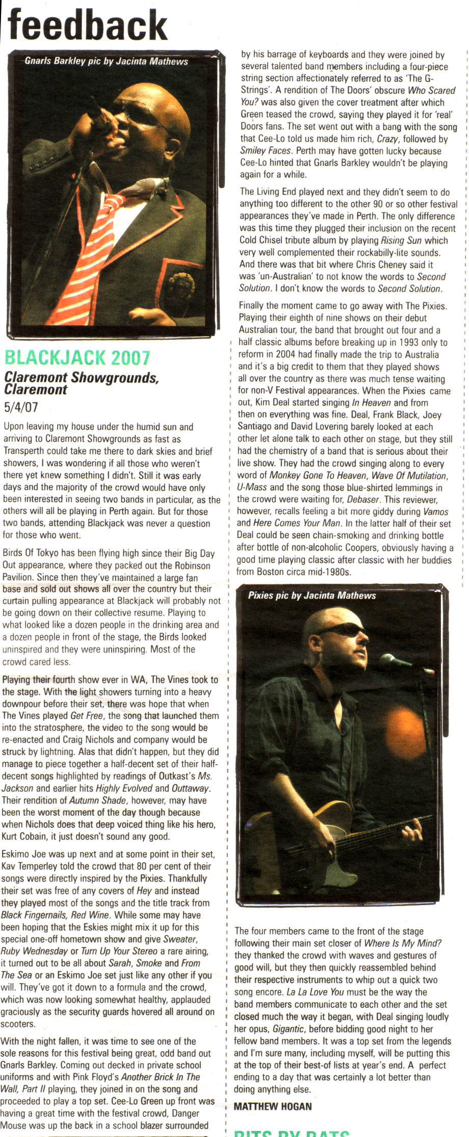 I saw a lot of good gigs in 2007, and not too many bad ones. Topping my list of favourite sets was the Pixies, playing at Claremont Showgrounds as part of the Blackjack festival. I had been waiting years to see the Pixies, and everything about their set was pretty much perfect. The band played a great selection of songs, and sounded fantastic - arguably the best mix I've ever heard. The band was far more charismatic than I was expecting, and the crowd was sizeable and enthusiastic - but not so big that things were uncomfortable and seeing the band was a problem. Everything was fantastic.