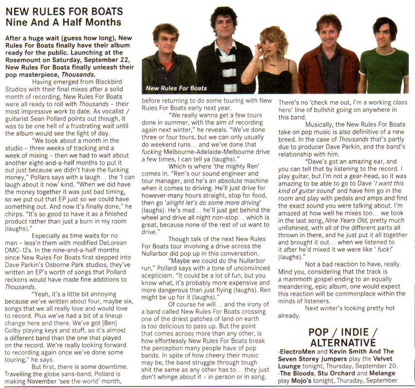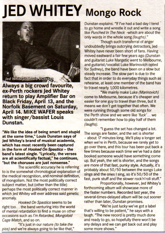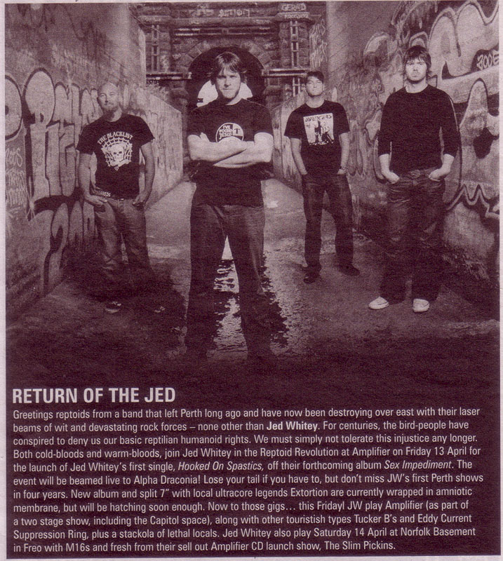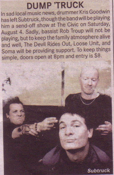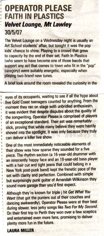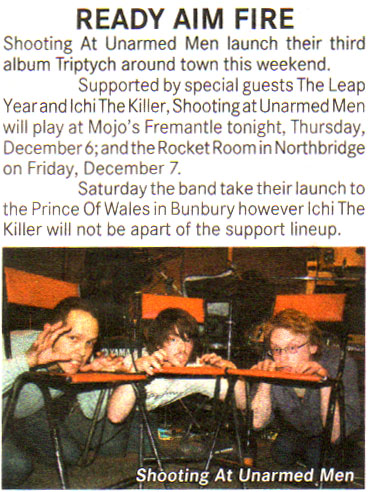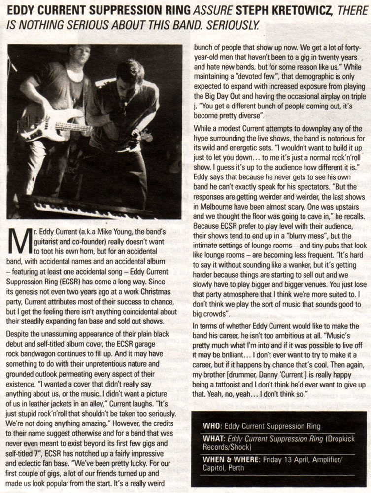 And finally, the Dirty Secrets get a mention. Why? They supported Muse at a very Guned show at the Supreme Court Gardens. During the Dirty Secrets set, the mass of punters waiting for Muse exerted too much pressure on the stage barrier, which collapsed. The Dirty Secrets had to stop playing for ages while the barrier was repaired. Everyone expected that once the barrier was fixed, Muse would come on. However, the crowd got a shock when the Dirty Secrets returned to the stage and played two more songs. When the band returned, there was a lot of loud boo-ing going on. The crowd was unhappy that the Dirty Secrets had returned. However, you would have never known this if you read the Dirty Secrets plug in Drum Media the following week, which stated: