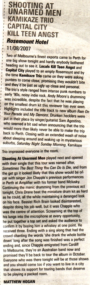 I saw Shooting at Unarmed Men play three shows this year. All were poorly attended, in particular a Thursday night gig at Mojos where only about 15 punters turned up. I have often seen bands drop the ball and play lackluster sets when faced with a small and unenthusiastic crowd . This was not the case with SAUM, who put on terrific shows each time I saw them. Their first show, at the Rosemount in August, was particularly good. I was so impressed I ended up shouting the entire band drinks afterwards.