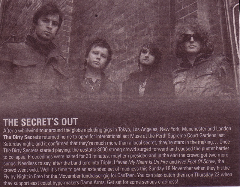 The Dirty Secrets returned home to open for international act Muse at the Perth Supreme Court Gardens last Saturday night, and it confirmed that they're much more than a local secret, they're stars in the making. Once the Dirty Secrets started playing, the ecstatic 8000 strong crowd surged forward and caused the punter barrier to collapse. Proceedings were halted for 30 minutes, mayhem presided and in the end the crowd got two more songs. Needless to say, after the band tore into Triple J faves My Heart is on fire and Five Feet of Snow, the crowd went wild.