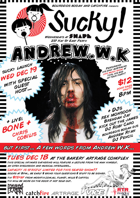 Andrew WK ventured to Australia in December 2007 to play some shows on the east coast. At the last minute, a couple of Perth dates were added, the first of which was a spoken word performance at the Bakery. The venue was decked out marvellously for the occasion (it was a seated gig), and punters had prepared questions to ask Andrew (e.g., Is it better to party soft, or not party at all?). Unfortunately, WK's working visa ran out the day before his Perth show, and he was not allowed to perform for fear of being barred from entering the country in the future. This was very disappointing. On the upside, he proved what a rad dude he is by coming out the front of the Bakery to meet his disappointed fans, and sign stuff for a number of hours.